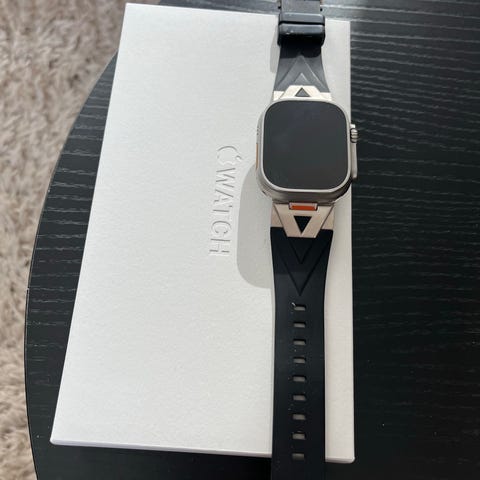 Apple Watch Series 4 med 44 mm. Klockan har svart sportarmband i silikon och pekskärm. Utrustad med digital krona, pulssensor och sensorer för aktivitetsmätning. Lämplig för vardagsanvändning, träning och notifieringar från ansluten iPhone. Levereras med laddare och extra armband enligt bild