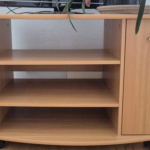 TV-bänk, sparsamt använd som förvaringshylla.