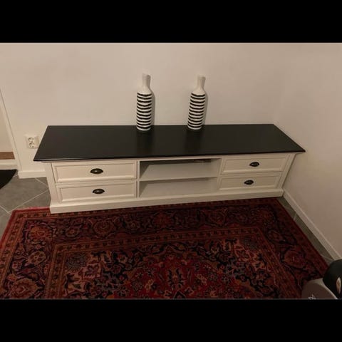 Grönmålad Bestå tv-bänk med två lådor med vita luckor