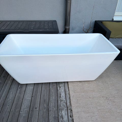 Fristående Gustavsberg badkar i vit färg med omgivande träpanel. Badkaret har rektangulär utsida med träpanel runtom och en inre, mer traditionell badkarsform. Passar för installation utomhus på altan eller inomhus där fristående badkar önskas. Konstruktionen består av ett vitt badkar monterat i en separat ställning med träinklädnad på ena sidan.