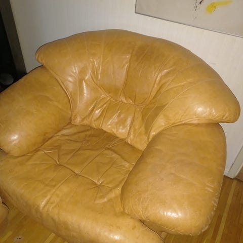Klong pall i svart skinn. Rund pall med ben i trä och mässing.
