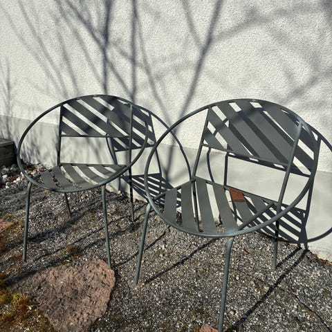 Stolar i metall i svart färg. Stolarna har rundad rygg med smala ribbor och rund sits. Passar exempelvis uteplats, balkong eller trädgård beroende på materialets tålighet mot väder och vind.