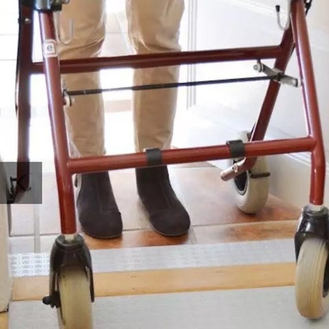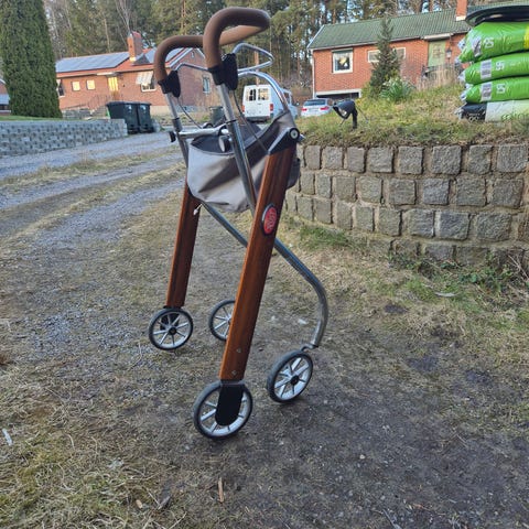 Trust Let’s Go rollator/ brickbord främst för inomhusbruk, med stabil aluminiumram och trädetaljer. Utrustad med fyra hjul, ergonomiskt handtag och broms. Rollatorn har en integrerad korg/väska i textil för förvaring.