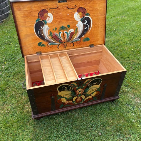Kista med sirligt blomstermotiv och härlig patina. Vacker form och lämplig storlek. Nyckel och fungerande lås.