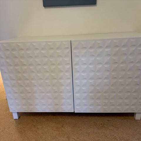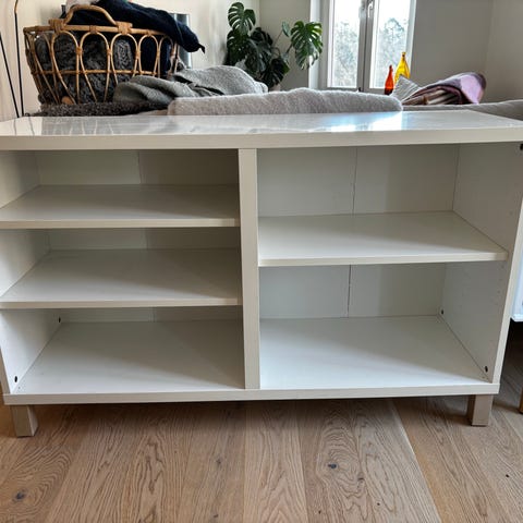 Tre stycken IKEA hyllor/bänk/skänk eller sideboard som jag tror ingår i serien BESTÅ (Ikea) med öppna fack i ljust vitaliserad ekeffekt. Består av flera staplade sektioner med rektangulära fack och hyllplan. Passar för förvaring av böcker, dekoration eller annan förvaring i vardagsrum, sovrum eller kontor. Neutral träfärg som fungerar i många typer av inredningar. Mått 120x40x38 cm