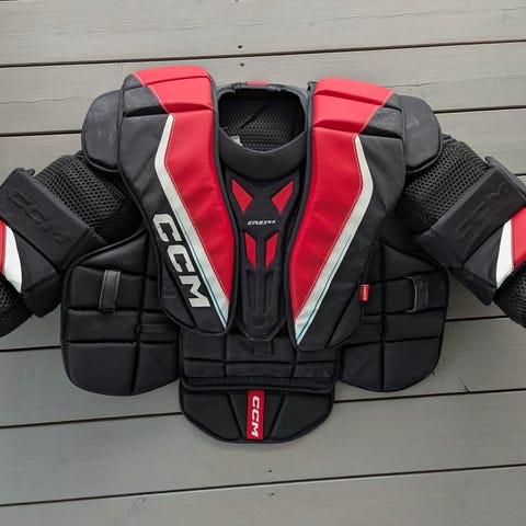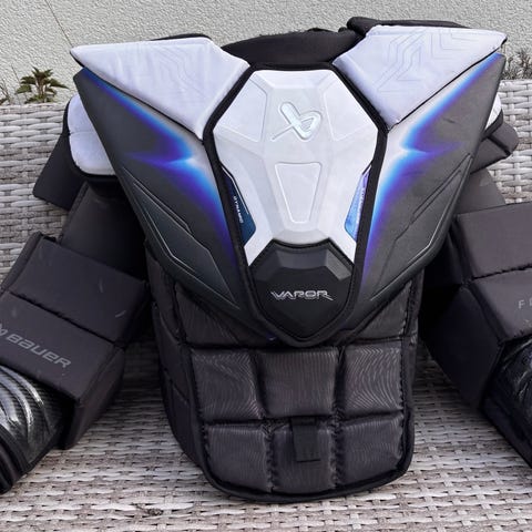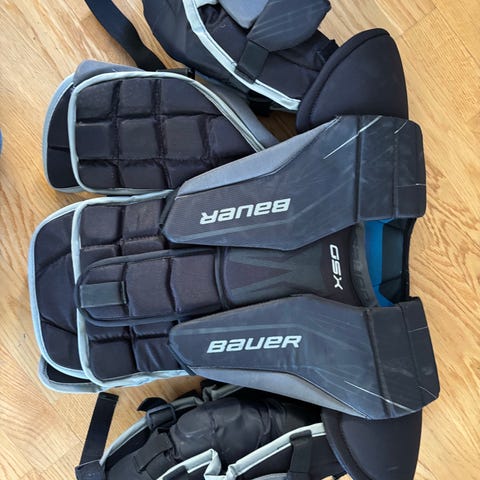 Bauer Elite kombinat för ishockey i seniorstorlek medium. Färg huvudsakligen svart med förstärkta skyddszoner över bröst, axlar och överarmar. Justerbara remmar och spännen för anpassad passform.