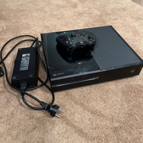 Microsoft Xbox One spelkonsol i svart färg. Konsolen levereras med nätadapter/strömkabel och en trådlös handkontroll enligt bild. Passar för spel, film och andra underhållningsfunktioner som stöds av Xbox One-systemet.