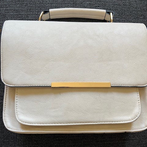 Portfölj med annorlunda metallspänne, 3 fack varav ett med dragkedja, justerbar axelrem i konstläder. Mått bredd 34 cm, höjd 27 cm, djup 7 cm.