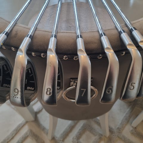 Ping i20 järnklubbor set i. Setet består av järn 4, 5, 6, 7, 8, 9 samt en wedge (W) varav 4an är Ping i25! Passar för golfspelare som söker ett förlåtande som är otroligt sköna för sin prisklass!