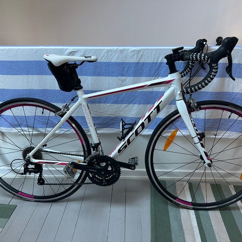 Trek landsvägscykel för man med ramstorlek 56 cm. Cykeln har smalare däck anpassade för landsvägskörning och ett sportigt styre med bockstyre. Utrustad med flaskhållare på ramen. Färgsättning i svart med blå och vita detaljer. Passar för landsvägsträning och pendling på asfalt för en förare som trivs med ramstorlek 56 cm.