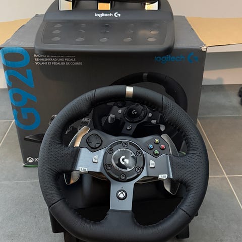 Logitech G920 med växelspak med back fungerar till Pc och Xbox. Den är beggagnad sen innan men har bara använts några få gånger hos mig. Den blev köpt 2021 av förra ägaren och vi köpte den 2026.