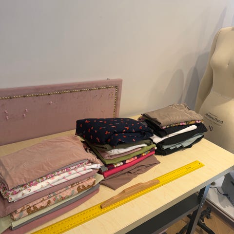 Samling sammetsliknande tygstycken i flera färger och olika mått.