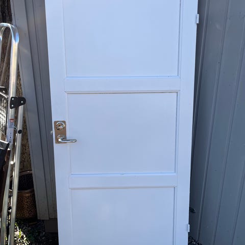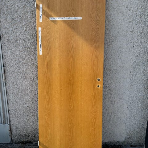 Innerdörr i trä med brun träfanér. Dörren har dörrhandtag och låskista monterad. Passar som innerdörr i bostad, förråd eller liknande utrymme. Exakta mått och gångjärnsplacering behöver kontrolleras vid hämtning eller enligt säljarens uppgifter. Finns både vänster och högerhängda dörrar.