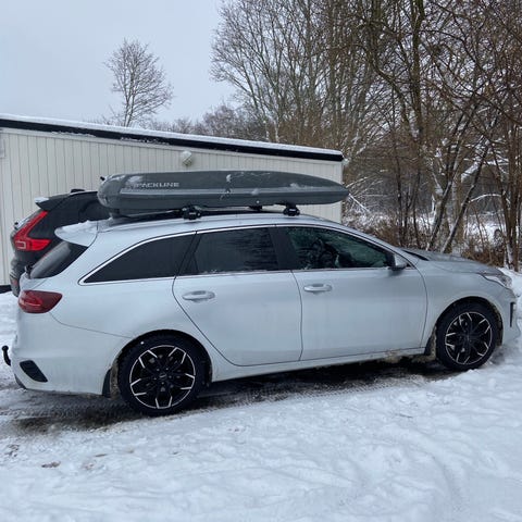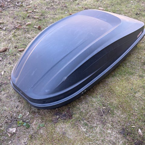 Takbox i svart färg. Monterad på takräcken enligt bilderna. Lämplig för extra lastutrymme på bil, exempelvis för resor och transport av bagage eller annan utrustning.