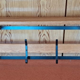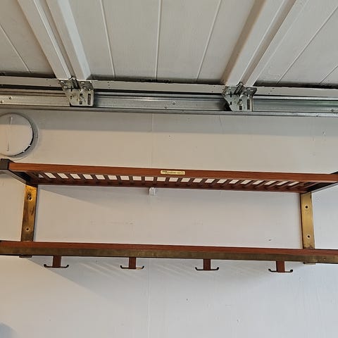 Hylla med hyllplan upptill. Hyllplanet består av träribbor. Under hyllplanet finns 2 st rundstav avsedda för galgar. Nederst 5 st krokar i smide.