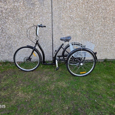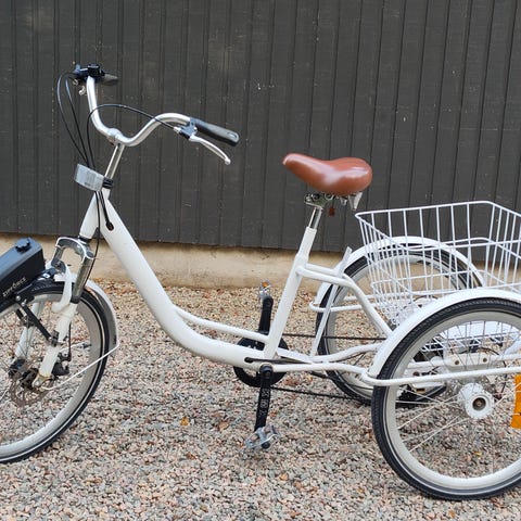 Monty trehjuling med 20" hjul i storlek M, unisexmodell. Korg fram och större lastkorg bak, stabil sadeln med ryggstöd. Sadeln går att justera mycket i höjled så den passar de flesta.