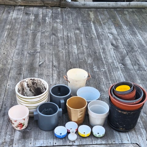 Krukor och vaser i blandade storlekar och färger. Flera krukor i plast och keramik, både mindre och större modeller, lämpliga för inomhusväxter. Färgerna inkluderar bland annat vitt, svart, grått, brunt och terrakotta. Två vaser ingår, en mörk vas och en genomskinlig glasvas med räfflad struktur. Passar för plantering av olika typer av växter samt för snittblommor eller torkade blommor.