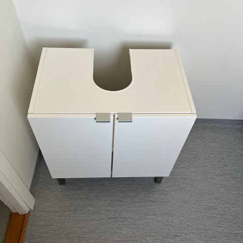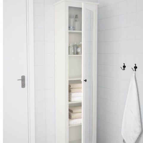 Ikea badrumsskåp i vitt utförande. Skåpet är högt och smalt med två dörrar och är utformat för att placeras över till exempel en tvättmaskin eller annan installation. Passar för förvaring av badrumsartiklar, handdukar och rengöringsmedel. Neutralt, vitt utförande som passar i de flesta badrum med kaklade väggar eller liknande inredning.