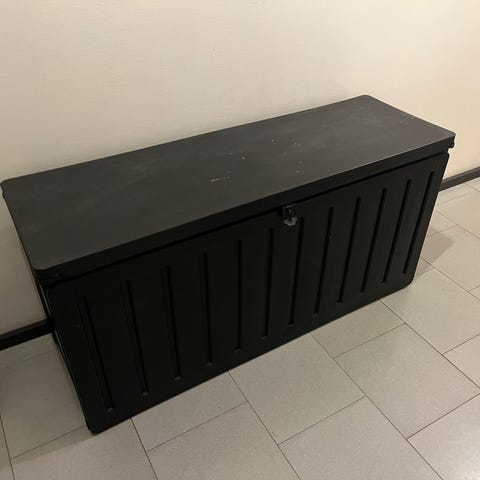 Svart stor och praktisk låda med hjul på ena sidan och ett tyg som täcker hela insidan.