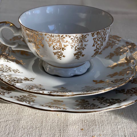 Klassiskt och elegant mönster med gulddetaljer – perfekt till kaffe, dessert eller som finservis.