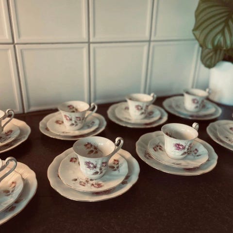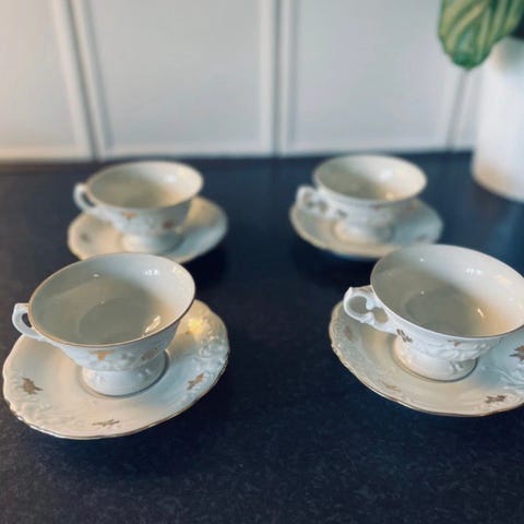 Säljer ett vackert set med 6 kaffekoppar och tillhörande fat i finare porslin från Gladstone, tillverkat i England.
