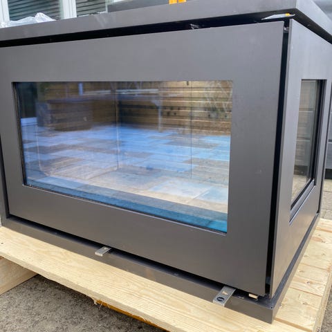 Kamininsats med dubbla glasdörrar i svart metall. Framdelen har två öppningsbara dörrar med glas för insyn till elden. Passar för inbyggnad i befintlig murad eldstad eller liknande installation där en sluten kaminlösning önskas.