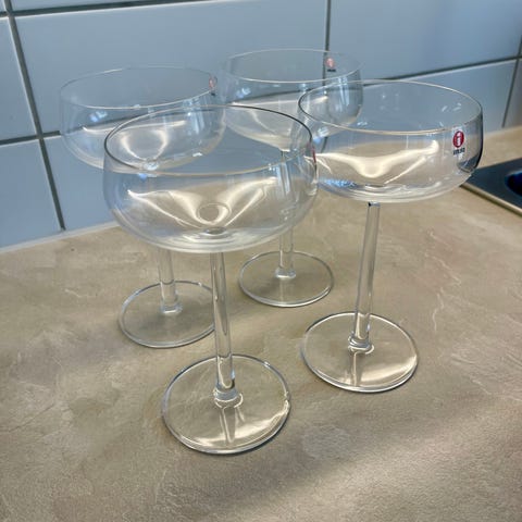 Iittala glas på fot i klarglas. Glasen har rund, vid kupa och hög fot, lämpliga för exempelvis drinkar, dessert eller servering av andra kalla drycker. Passar i kök och matsal för vardag och fest.