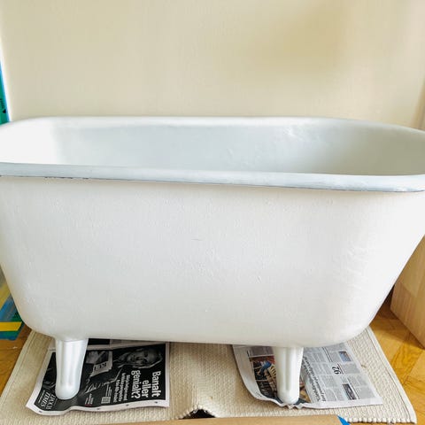 Fristående badkar i vitt emaljerat utförande. Rektangulär modell med avrundad insida. Badkaret står på hjul och är avsett för installation mot vägg eller fristående placering. Passar för användning i badrum eller som vattenkar i trädgård eller liknande. Skick och rengöringsbehov framgår av bilderna.