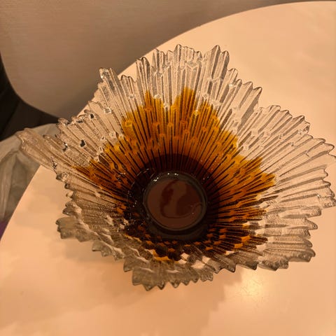 Karaktäristiskt kraftigt glas med dekorativt reliefmönster och vågig kant som skapar ett mycket fint ljusspel