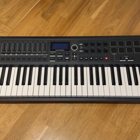 Novation Impulse 61 MIDI-klaviatur med 61 anslagskänsliga tangenter i fullstorlek. Utrustad med reglar, rattar, pads och transportkontroller för styrning av musikprogram. Enhet i svart utförande. Medföljer vadderad transportväska från Novation med flera ytterfack för tillbehör och även stativ som syns på bilden.