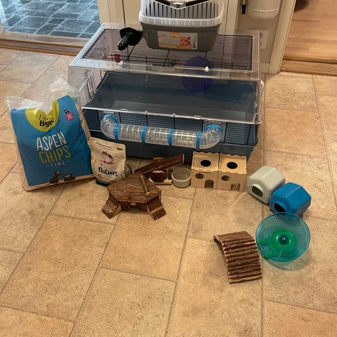 Smådjur bur med tillbehör i plast och trä. Setet innehåller en genomskinlig plastbur med gallerlock,m, två påsar strö, ett plast/transportbur, en genomskinlig motionsboll samt flera trähus, träbro och trähjul. Passar för mindre gnagare som hamster eller mus.