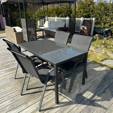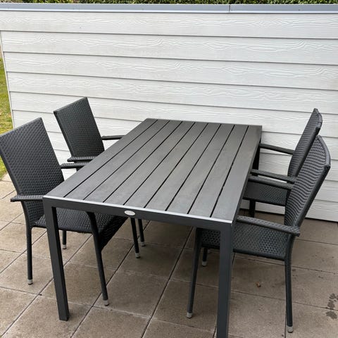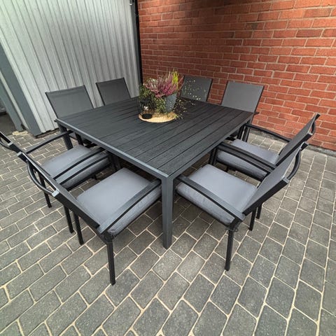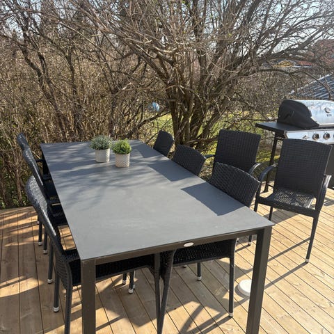 Matgrupp för utomhusbruk bestående av ett rektangulärt bord och åtta stolar i svart färg. Bordet har rak, slät bordsskiva och fyra ben. Stolarna har armstöd och ribbad rygg samt sitsar med lösa dynor. Passar exempelvis på altan, uteplats eller inglasad balkong för större sällskap vid måltider och samvaro.