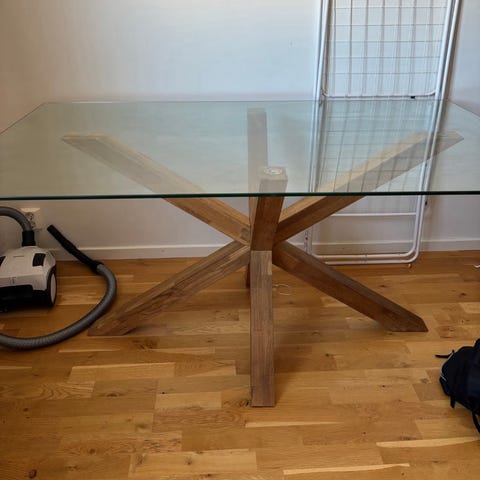 Mio matbord med rektangulär bordsskiva i glas och underrede i metall. Bordet har ett korsformat stativ som ger stabilitet och ett öppet uttryck. Formgivet av Jørgen Gammelgaard. Passar som matbord eller arbetsbord i kök, vardagsrum eller matplats. Exakta mått och vikt saknas.