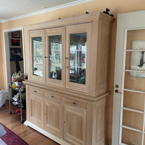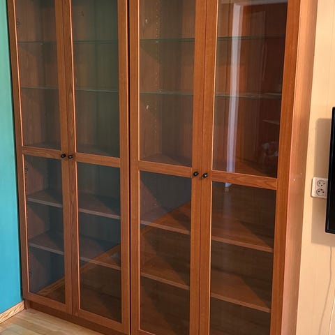 Vitrinskåp med glasdörrar i massiv ek. Skåpet har flera sektioner med hyllplan i glas som ger god överblick och plats för förvaring av glas, porslin eller prydnader. Skåpet är i massiv ek och dörrar och lådor har handtag framtill. Belysning i vitrindelen. Varsamt använt.