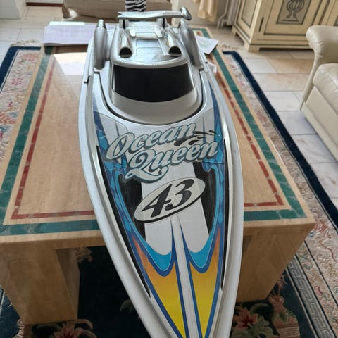 Century radiostyrd segelbåt i vit färg med blå dekor. Båten står på ett enkelt träställ och styrs med medföljande kontroll. Segelbåten är avsedd som modell- och hobbybåt för användning på vatten. Använd endast 1 gång, har stått sen några år tillbaka, behöver nya stagsnören.