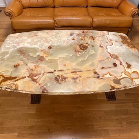Vardagsrums bord, konst marmor, lös skiva som ligger på två vinklade ben, tungt