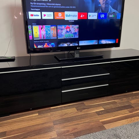 Svart TV-bänk med högblank toppskiva och kabelhål på baksidan. Bra för förvaring av tv-box, router, spelkonsol eller annan elektronik.