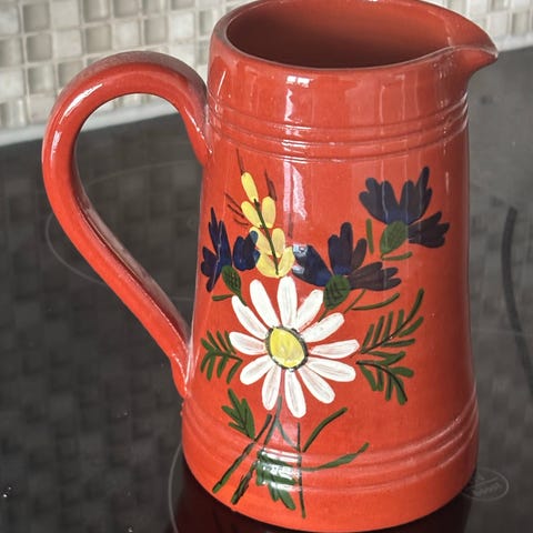 Keramikvas i brun ton med dekor i form av gröna blad runt om vasens mittparti. Vasen har två små handtag upptill och en glaserad insida i mörk färg. Undersidan är stämplad med nummer och signatur. Passar som vas eller som dekorativ inredningsdetalj.