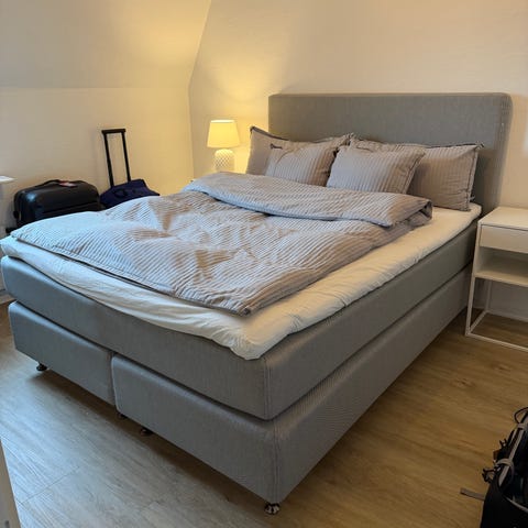 Det finns ett mindre beige/brunt märke på bäddmadrassen. Min bedömning är att det går att få bort med en ordentlig tvätt/rengöring. De flesta väljer ändå att fräscha upp en begagnad bäddmadrass, så här finns möjlighet att få den att kännas i princip som ny till en bråkdel av nypriset.