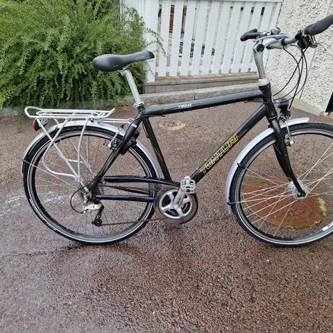 Nyservad cykeln till salu, 28 ”tum 21”vxl, nya bakbromsklossar, nytt ringlås m 2nyklar,reflexer bak och fram allt funkar.