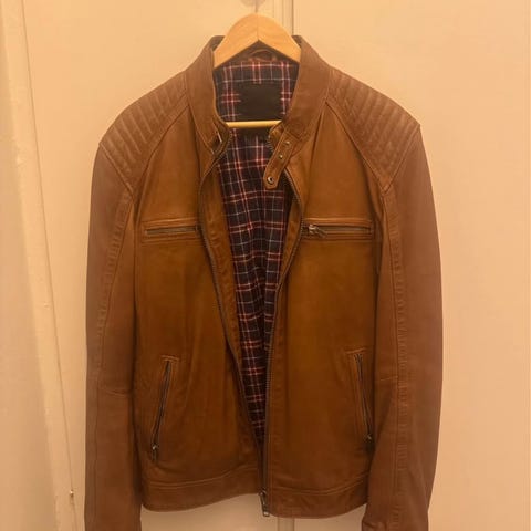 Klassisk skinnjacka för herr i storlek L. klassisk bikerdesign, dragkedjor framtill och flera fickor. Jackan har quiltat foder på insidan, ”Bra slitning för snygg vintage-look ”