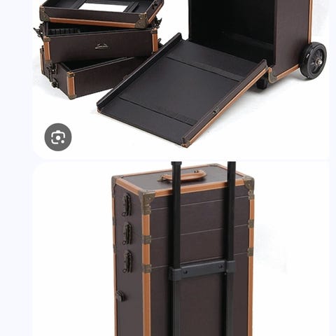 Svart vagn med lådor på hjul i plast. Vagnen har flera utdragbara fack/lådor på framsidan samt en ovansida med indelade fack och rund fördjupning för förvaring av mindre saker. Utrustad med hjul för enkel förflyttning och ett handtag på sidan. Passar till exempel för förvaring av hår- och skönhetsprodukter, kontorsmaterial eller hobbytillbehör.