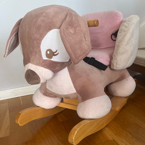 Gunga på denna squishy häst och häng på. Barn kommer att älska att höra klippet av hovarna när de går. Inga batterier behövs. Perfekt för alla barnkammare eller lekrum, denna gunghästleksak är gjord av ultramjuka och säkra material som är ftalater och BPA-fria. Hård trä på handtagen och vipporna.
