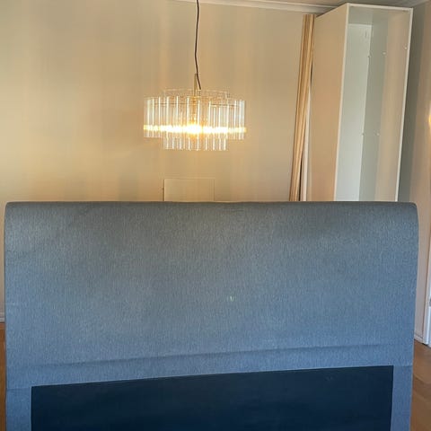 IKEA sänggavel i grå textilklädsel. Gaveln har en vadderad framsida med knapptuftad dekor och slät baksida. Passar som huvudgavel bakom säng och kan placeras mot vägg. Materialet är tyg med mjuk stoppning som ger en bekväm yta att luta sig mot vid läsning eller vila i sängen.