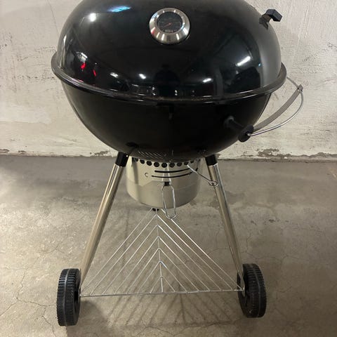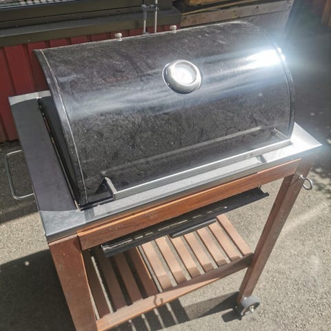 Grilltunna kolgrill i svart metall. Utrustad med termometer i locket, handtag framtill samt hylla under för förvaring. Grillen står på ben med två hjul för enklare förflyttning och har en sidoyta i metallgaller för avställning. Passar för grillning med kol eller briketter på uteplats eller i trädgård.