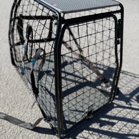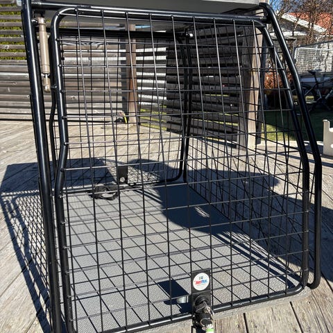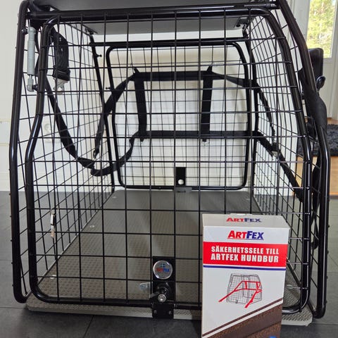 Artfex Hundbur i storlek S i fint skick. Buren är stabil, skramlar inte och kan monteras på valfri sida i bilen. Golv och tak är försedda med gummi för att ge bra grepp under körning. Den har evakueringslucka, gasdämpare för luckan och är låsbar med nyckel. Nycklar och spännband medföljer. Djup: 670mm, Bredd: 423mm, Höjd: 500mm.