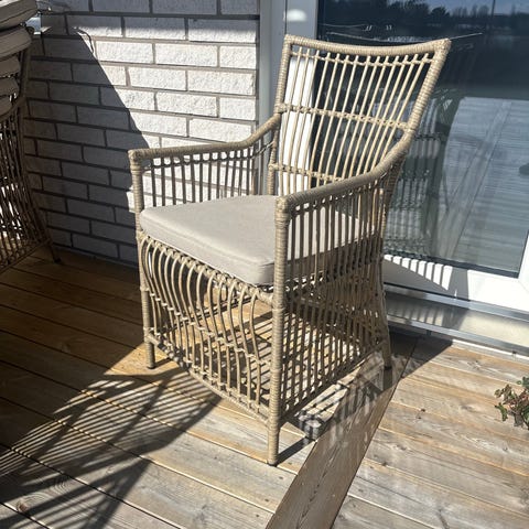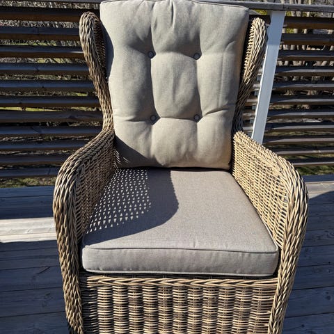 Två stycken fotöljer/stolar i konstrotting för utebruk./balkong. Nu 1000:- styck. Nypris var 2500:- styck. Mkt bra skick, har varit på vinden pga utrymmesbrist.