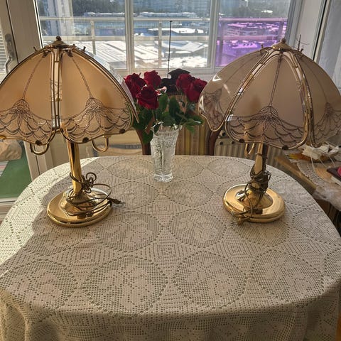 Bordslampor med fina detaljer säljs I par. Elsladdarna är ombyta för 5 år sedan. Sällan användes ( mest på landet).