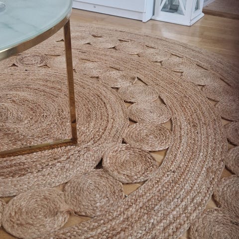 H&M Home rund matta i naturfärgad, flätad design. Mattan är tillverkad i ett grovt, strukturerat material som ger ett naturligt uttryck. Passar exempelvis under matbord, i vardagsrum eller hall för att skapa en mjukare yta och markera en sitt- eller matplats.