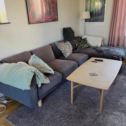 Soffan är i använt men gott skick. Sittpuffen/divanen ger möjlighet till dold förvaring av t ex spel, extra filtar eller liknande. Prydnadskuddarna och den lila filten medföljer!